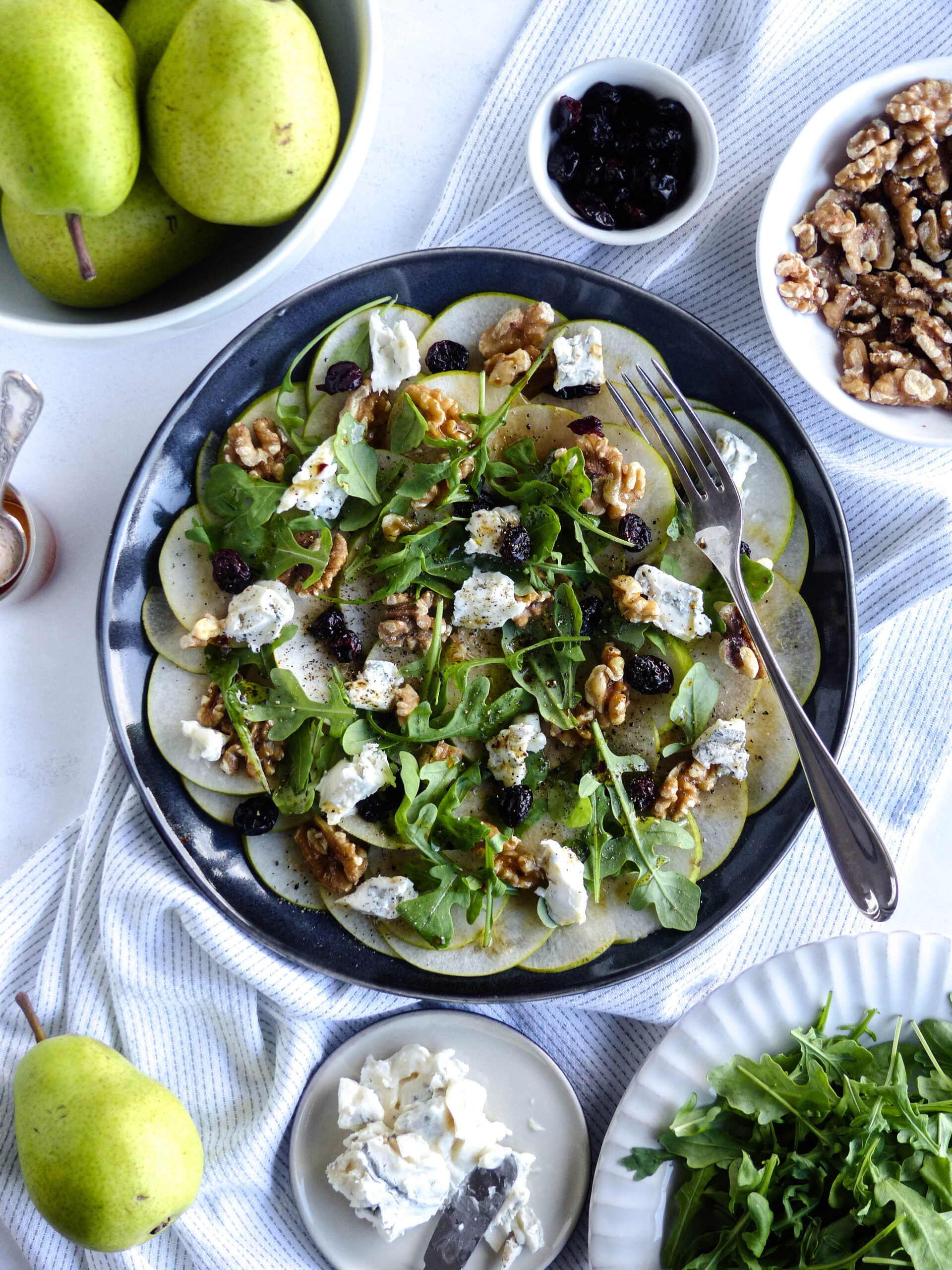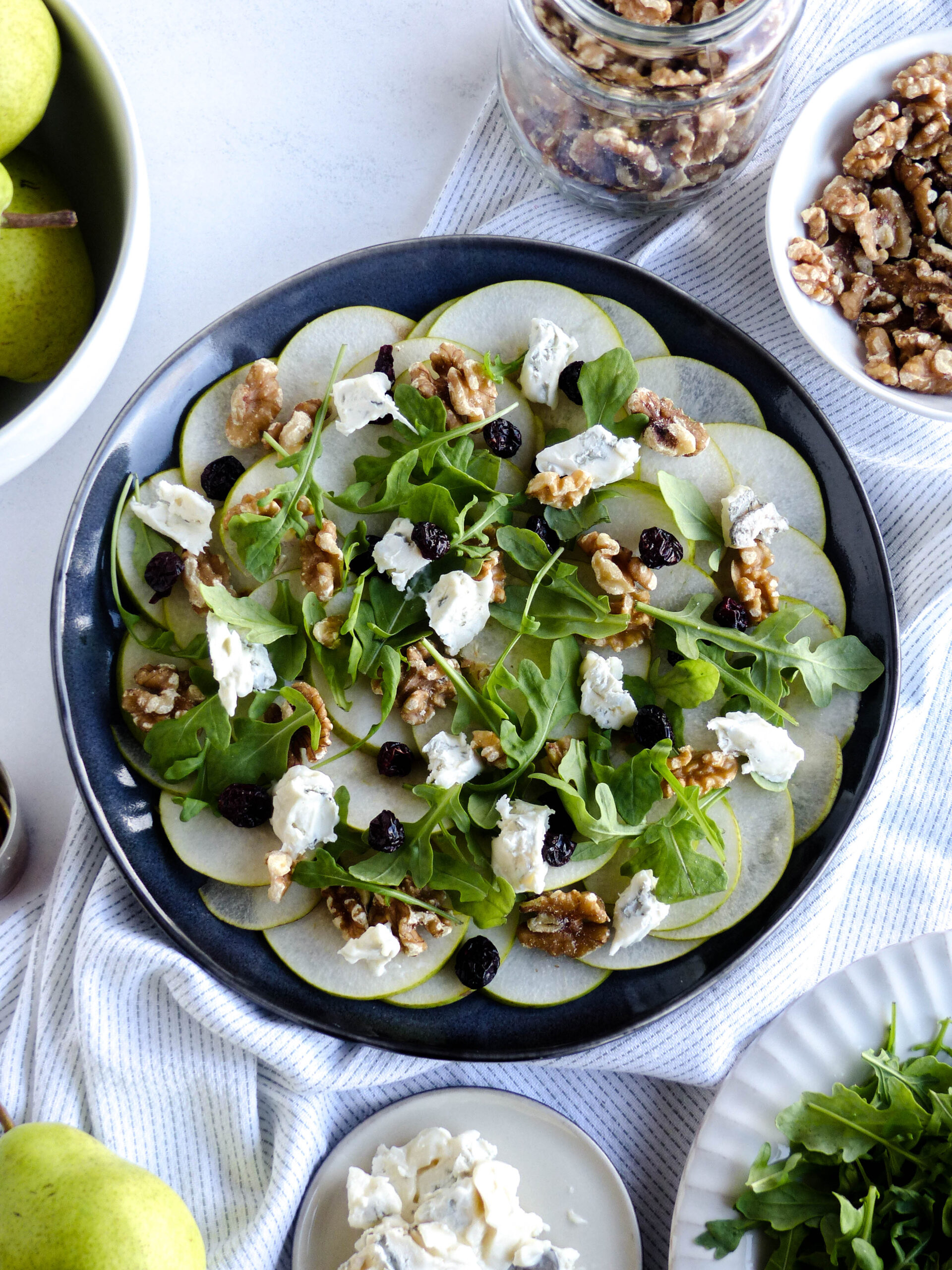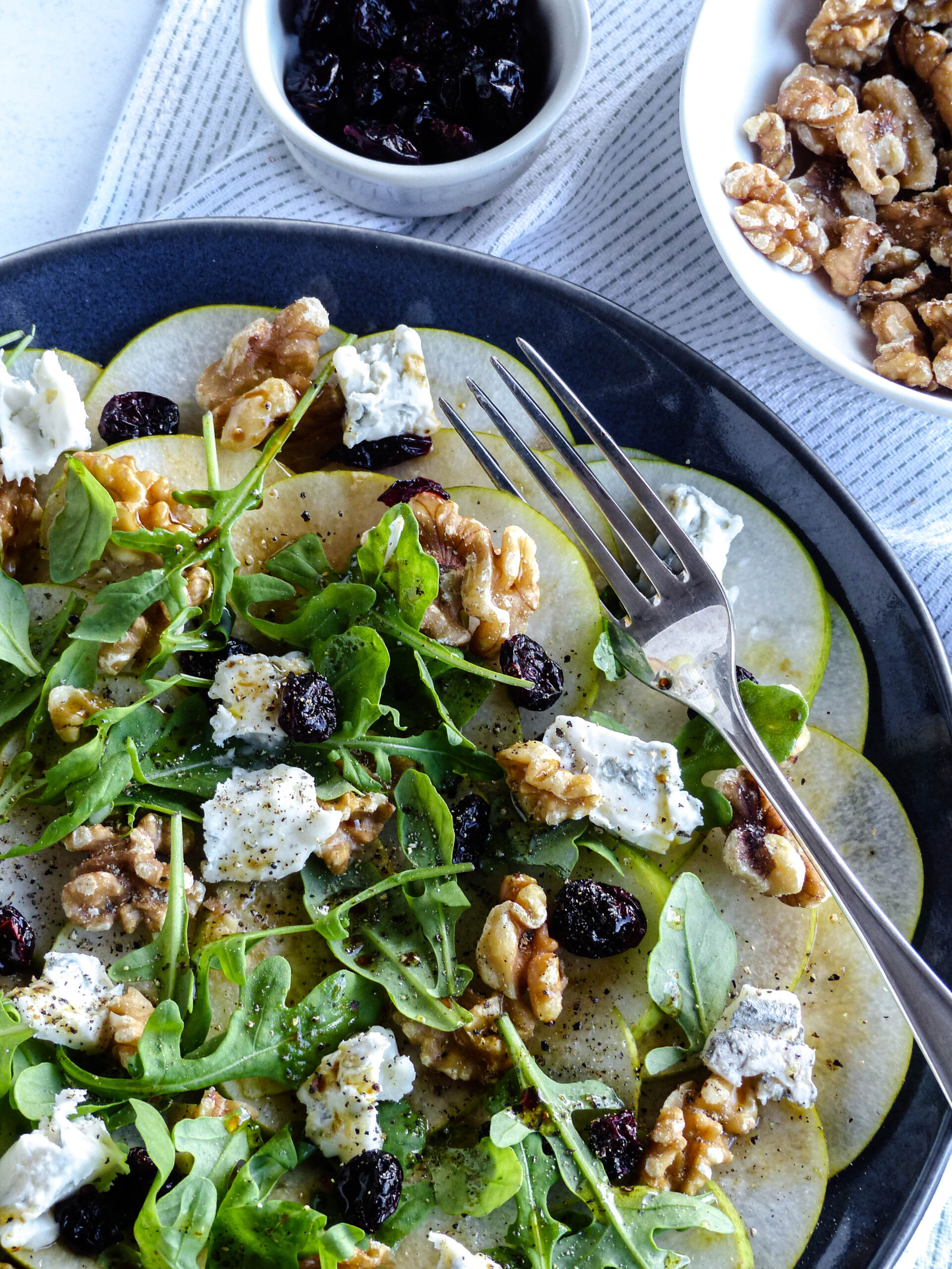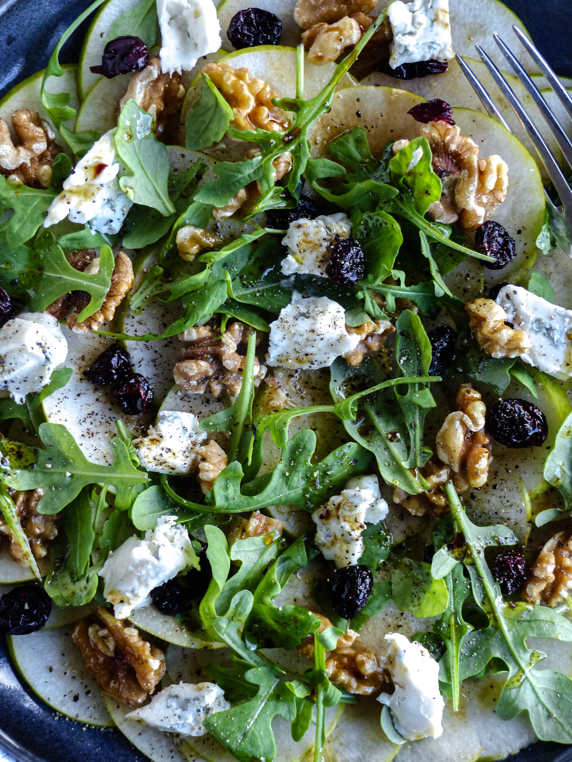 - Den Rucola locker über die Birnenscheiben verteilen.Den Gorgonzola in kleine Stücke zupfen oder würfeln und über das Carpaccio geben.Dann Walnüsse und Cranberries darüberstreuen – das bringt Crunch und eine feine Süße.